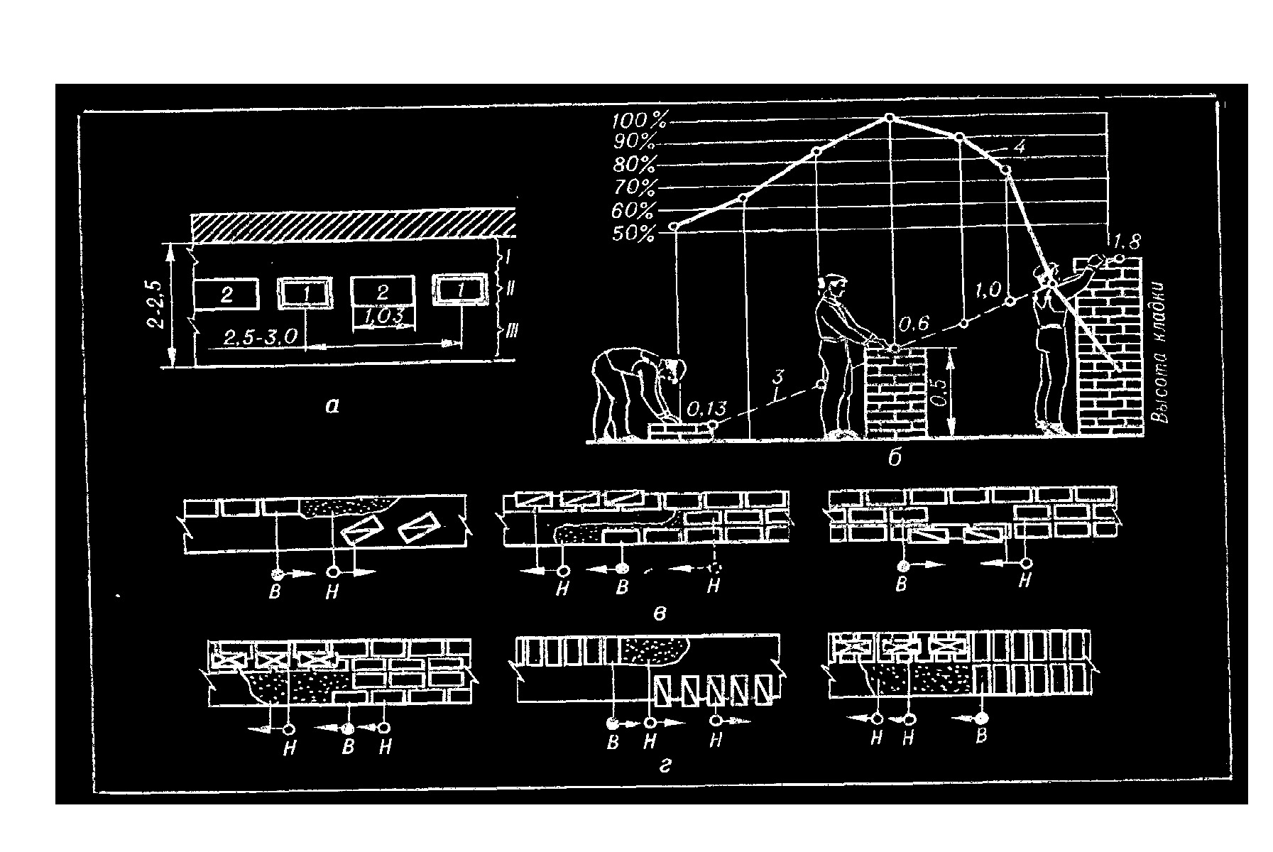 а — рабочее место; б — график производительности труда каменщиков: в — работа звена-«двойки»: г — то же, «тройки»: 1 — ящики с раствором; 2 — пакеты кирпича; 3 — линия увеличения высоты кладки; 4 — кривая зависимости производительности труда от высоты кладки; I — III — зоны (рабочая, материалов и транспорта); Н — каменщик низшего разряда; В — каменщик высшего разряда