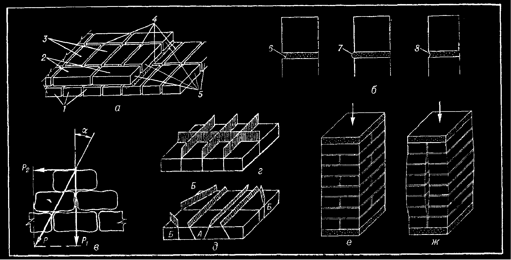 а — элементы кладки; о — расшитые швы; в — воздействие на кладку наклонной силы: г — правильное и д — неправильное расположение плоскостей разрезки; е — кладка с перевязкой швов: ж — кладка без перевязки швов; 1 — тычковый ряд; 2 — ложковый ряд; 3 — забутка; 4 — швы; 5 — версты (внутренняя и наружные); 6, 7, 8 — швы (неполный, выпуклый и вогнутый)