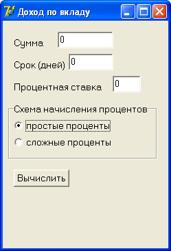 Далее производится ввод требуемых значений суммы вклада, срока вклада и процентной ставки. По умолчанию стоят значения равные 0. Затем выбирается схема начисления процентов – простые или сложные. После того как введены все данные по вкладу, можно вычислить доход по вкладу нажатием кнопки «Вычислить». Результат выводится в этом же окне.