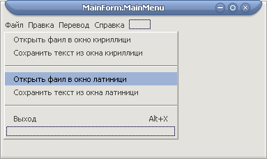 Программа для перевода текстов с транслита на русский и обратно. Поддерживается форматирование текста, наиболее популярные системы транслитерации ГОСТ 16876-71, русско-английскую, а также таблицы, задаваемые пользователем. Программа должна иметь функцию перевода символов текста к верхнему и нижнему регистру, функцию подсчета количества символов в тексте. Загрузка текста из буфера обмена может осуществляться по быстрой кнопке.