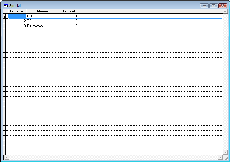 Сам объект grid позволяет полностью просматривать информацию, о том какие специальности находятся в базе данных и какой у них уникальный код.