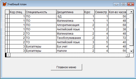 Сам объект grid позволяет полностью просматривать информацию, о том какие дисциплины находятся в базе данных и какой у них уникальный код.