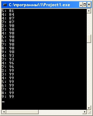 Для написания этой программы воспользуемся функцией sumc (умножение I на любое однозначное число ). Для проверки кратности удобно использовать операцию mod, позволяющую определить остаток при делении целых чисел. Так как числа двузначные, то цикл будет от 10 до 99.