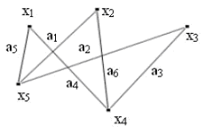 Граф G (рис.2.1.1) задается множеством точек (вершин) х>1>, х>2>,..., х>n>. (которое обозначается через Х) и множеством линий (ребер) а>1>, а>2>,...,а>m>. (которое обозначается символом А), соединяющих между собой все или часть этих точек. Таким образом, граф G полностью задается (и обозначается) парой (Х, А). Если ребра из множества А ориентированы, что обычно показывается стрелкой, то они называются дугами, и граф с такими ребрами называется ориентированным графом.