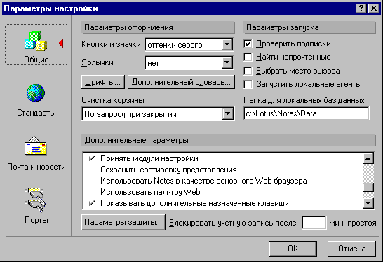 Существует несколько простых правил, позволяющих уменьшить вероятность несанкционированного доступа к серверу Domino. Необходимо чтобы пользователь задавал пароль для доступа к ID-файлу достаточно сложным. Администратор может потребовать от пользователя использовать пароль не короче определенного количества символов. Кроме того, необходимо, чтобы в пароле чередовались строчные и прописные символы, а также были включены цифры. Желательно, чтобы пользователь блокировал свою рабочую станцию вручную или задавал время блокировки при простое. Это делается либо нажатием клавиши F5 на клавиатуре, либо через меню «Файл-Параметры-Параметры настройки», как показано на рисунке