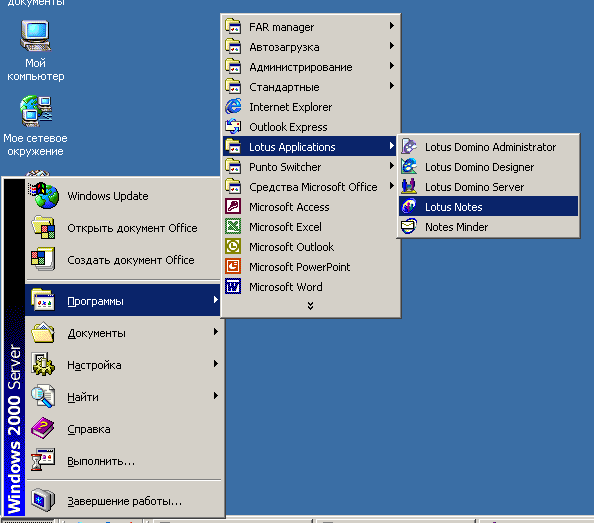 Для запуска Lotus Notes необходимо, нажав на кнопку Пуск, а далее выбирать последовательно Программы - Приложения Lotus - Lotus Notes