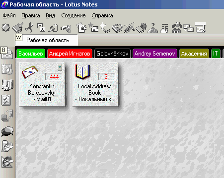 Интерфейс Lotus Notes помимо стандартных меню, характерных для любых Windows-приложений, содержит некоторые специфичные элементы, такие как панель закладок и панель задач. Панель закладок организует закладки. С ее помощью пользователь системы может ускорить доступ к различным функциям системы. Закладки Notes создаются так же, как и в браузере, но эти закладки могут указывать на элементы как Notes, так и Интернета, включая базы данных, представления, документы, Web-страницы и группы новостей. |