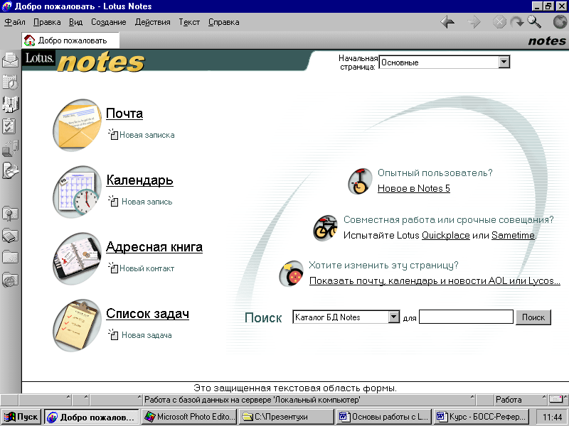 После первого запуска Notes на рабочей станции, Вы получаете вид, показанный на рисунке. Эта страница стала стартовой, начиная с версии 5. Переключение в режим «Рабочей области» показано на рисунке