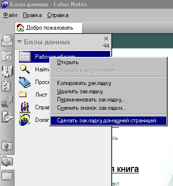 При работе в Lotus Notes в любой момент времени доступны также контекстные меню, вызываемые нажатием правой кнопки мыши. Контекстные меню отображаются для закладок, значков, документов, баз данных и т. д., предоставляя команды, которые достаточно просто щелкнуть. Большинство команд, содержащихся в контекстных меню, доступны также через основные меню. |