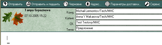 Почтовое сообщение Notes такое же, как и любой документ Notes. Например, Вы можете изменять шрифт и цвет, добавлять вложения, включать таблицы, графику и ссылки. Каждый пользователь Notes хранит сообщения в почтовой базе данных.