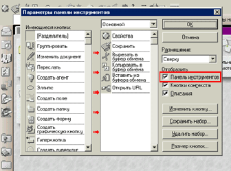 По умолчанию панель инструментов выключена. Чтобы отобразить ее, выберите в верхнем меню Файл - Параметры - Параметры панели инструментов. В открывшемся диалоговом окне установите флажок "Панель инструментов". При необходимости с помощью этого окна пользователь может создать и сохранить свой собственный набор значков для использования вместо стандартного набора. |