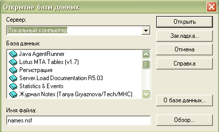 Выберите в списке баз данных имя базы, при этом в поле “Имя файла” будет отображаться имя файла базы данных, например, “БД Адресная книга” имеет имя файла names.nsf. Список баз данных может включать подкаталоги основного каталога данных Notes.