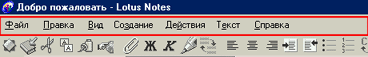 В верхней части окна Lotus Notes располагается меню. Все его элементы являются контекстно-зависимыми. Наличие некоторых пунктов напрямую зависит от того, какая операция выполняется в данный момент. В качестве примера можно привести пункты меню Файл, Правка, Создание и Действие. Пункты меню Текст, Таблица, Рисунки и некоторые другие появляются только при работе с соответствующими типами данных. |