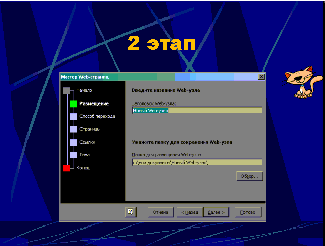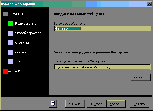 На этом этапе указываем папку для сохранения Web-узла и заголовок Web-узла. Переходим на этап "Способ перехода".