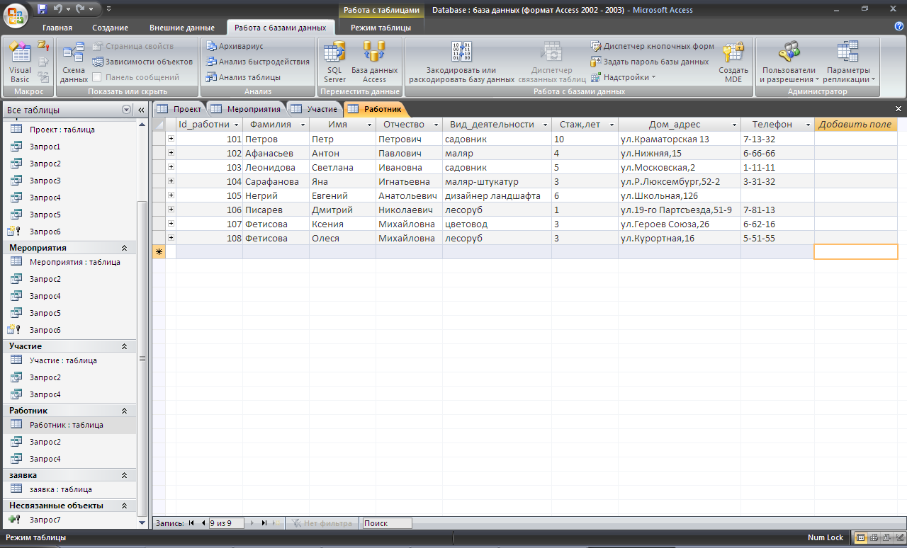 Работник (Id_работника, Фамилия, Имя, Отчество, Вид деятельности, Стаж, Домашний адрес, Телефон).