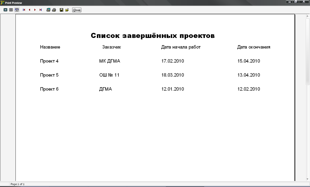 5) Вывод отчёта по завершённым проектам.