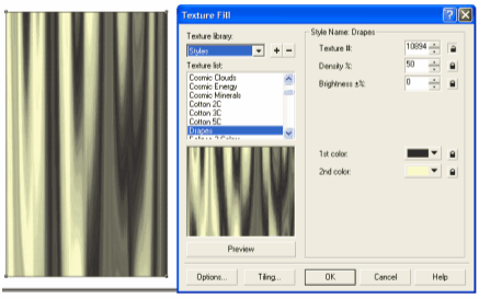 Рисуем прямоугольник побольше и заливаем его градиентной заливкой, для этого выбираем инструмент Texture Fill.В открывшемся окне в поле Texture Library выбираем пункт Drapes, в поле Texture List выбираем Nail Pops. Нажимаем OK. В результате получаем: