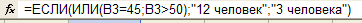 Установим курсор мыши в ячейку D3. Вставка => Функция и из списка выберем Если. Появится диалоговое окно в котором необходимо ввести условия. Так как нам необходимо еще и значение или, то в первой строке напишем “ИЛИ(B4=45;B4>50)”. При этом мы получаем условие >50 или =45