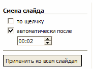 Таким образом создаем остальные слайды. После создания всех слайдов необходимо установить, будут ли они сменятся по щелчку, или автоматически через определенный промежуток времени. Для этого зайдем на вкладку Смена слайдов (меню Показ слайдов).
