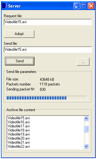 Активізований при запуску програми “Server” компонент IdUDPServer починає процес передачі відеофайлу при натисненні адміністратором кнопки “Send” (рис. 4).