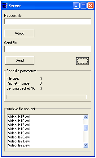 При запуску програми “Server” на екрані адміністратора з'являється вікно представлене на рис.3.1. Програма-сервер (сервер) переходить в режим прослуховування. При запуску програми “Client” на екрані користувача з'являється вкладка “Interactive” вікна, що представлене на рис. 3.2. Програма-клієнт (клієнт) автоматично встановлює зв'язок з сервером. Для приймання списку доступних відеофайлів, клієнт посилає запит серверу, що супроводжується натисненням користувача кнопки “Send list request”. Після отримання запиту від клієнта, сервер автоматично посилає список доступних відеофайлів, який вказаний на панелі “Archive file content”. Отриманий список відображається на панелі “Available files list” клієнта. Вибраний користувачем файл поміщається в рядок вводу “Chosen file”. Для отримання вказаного файлу, клієнт посилає запит на сервер, що супроводжується натисненням користувача кнопки “Send videofile request”. Отримана назва файлу запиту від клієнта поміщається в рядок вводу “Request file” на сервері. Затвердивши запит, адміністратор натискає кнопку “Adopt”, після чого назва файлу відображається в рядку вводу “Send file”. Адміністратор може вручну вибрати файл, натиснувши кнопку “...”. Відправка файлу здійснюється після натиснення кнопки “Send”. Параметри передачі файлу відображаються на панелі угрупування компонентів “Send file parameters”. Користувач проглядає отриманий файл на відеопрогравачі, розміщеному на вкладці “Video player”, за допомогою кнопок управління “Play”,”Pause” і “Stop”.
