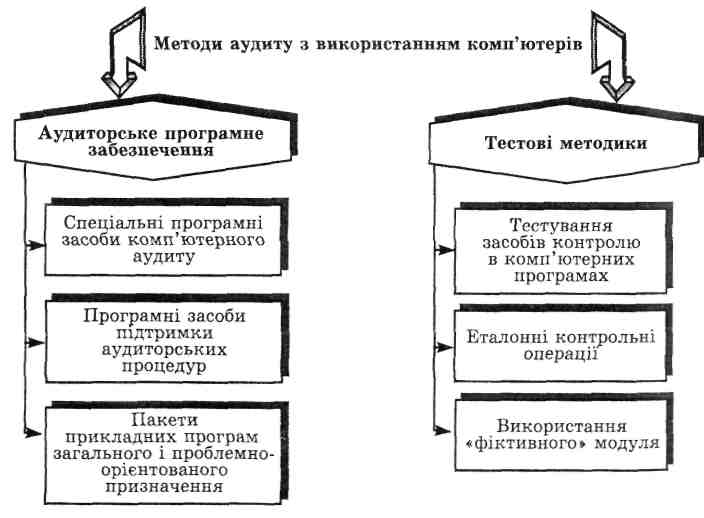 Комп'ютеризація обліку суттєво впливає на проведення аудиту. Однак і сам комп'ютер може стати інструментом аудитора, що дає йому змогу не лише скоротити час і витрати при проведенні аудиту, а й провести більш детальну перевірку і скласти якісний аудиторський висновок з рекомендаціями зі стратегії, за напрямками і засобами поліпшення фінансово-господарського становища підприємства. Положення про міжнародну аудиторську практику 1009 "Методи аудиту з використанням комп'ютерів" описує такі методи аудиту з використанням комп'ютерів (рис.1).