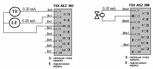 - напівформатний модуль аналогових входів TSX AEZ 802, який розташований на 3-му місці і працює з 8 аналоговими сигналами 0-20 або 4-20 мА;