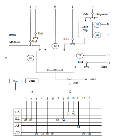відкривається клапан 2 і в дозатор подається фермент, поки не спрацює датчик верхнього рівня дозатора