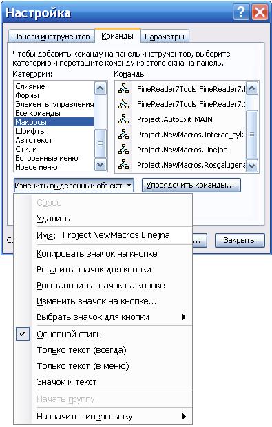 При відкритому діалоговому вікні «Команди» в контекстному меню виконуємо команду «Основной стиль».