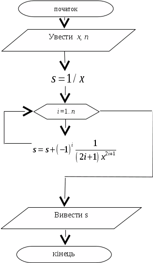 s = s + ((-1) ^ i) * (1 / ((2 * i + 1) * (x ^ (2 * i + 1))))