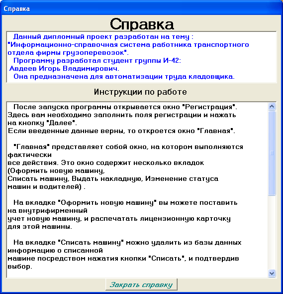 В данном дипломном проекте решена задача создания информационной системы работника транспортного отдела фирмы грузоперевозок, имеющая основные функциональные возможности реальной системы.