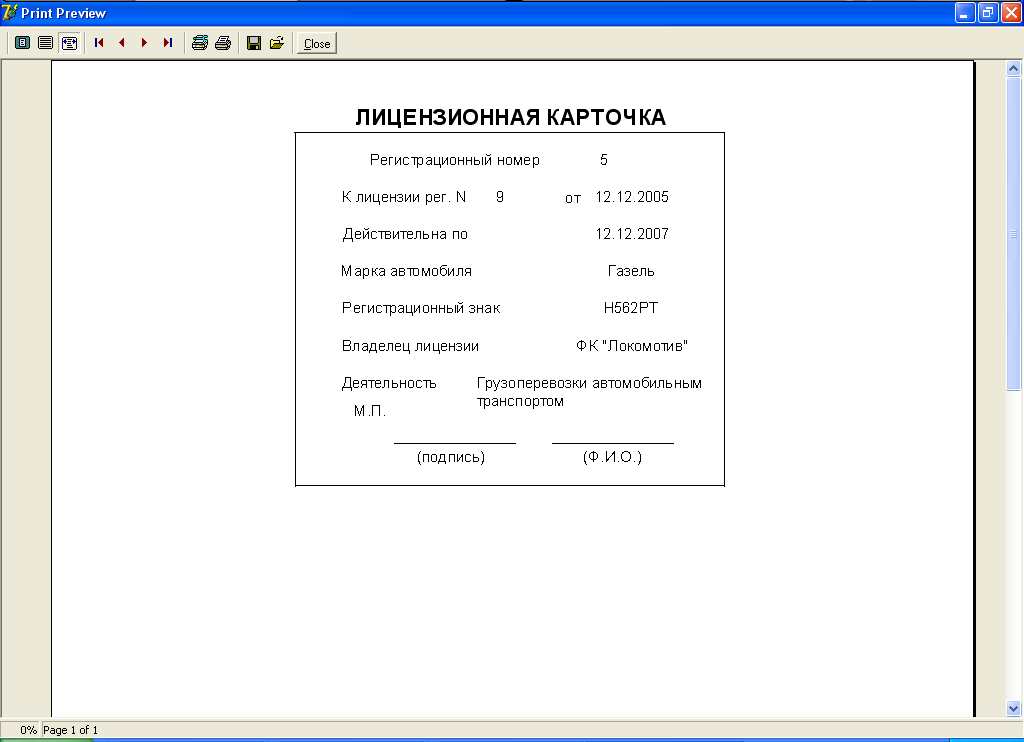 вывод лицензионной карточки на печать;