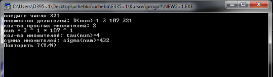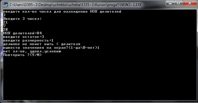 делителя и остатка на отриц-сть} begin write ('делитель или остаток не могут быть<0 '); end else begin if i>k then {проверка на делитель>остатка} begin write ('введите размерность='); readln(R); if R<=0 then begin writeln ('некорректная размерность '); readln; end else begin if R=1 then begin a:=1; b:=9; end else begin a:=pow(10,(R-1)); {инициализация верх и нижн границ} b:=pow(10,R); b:=b-1; end; end; if b<i then {проверка на делимое>делителя} writeln ('делиоме не может быть < делителя ') else begin SUM:=0; {обнуление сумы кол-ва эл-ов} for D:= a to b do begin if (D mod i)=k then {проверка эл-ов на условие} begin SUM:=SUM+1; end; end; writeln; writeln ('кол-во эл-ов с делителем=', i:3, ' и остатком=', k:3, ' равно', SUM:6); end; {b<i} end {if i>k} else write ('остаток не может быть > делителя '); end; {if otriz} {\\\\\\\\\\\\\\\\\\\\\\\\\\\\\\\\\} write ('вывести значения на экран?(1-да\0-нет)'); readln(S); if S=1 then if SUM=0 then writeln('нет эл-ов, удовл. условию') else begin for D:= a to b do if (D mod i)=k then begin write(' ',D:4); {вычисление кол-ва делителей и их мн-ва} for i:= 1 to n do begin write(numb[i], ' ^ ', powers[i]); k:=k*((pow(numb[i],powers[i]+1) - 1) div (numb[i] - 1)); t:=t*(powers[i]+1); {кол-во делителей} if i <> n then write(' * '); end; writeln; writeln('кол-во множителей: tau(num)=',t); writeln('сумма множителей: sigma(num)=',k); writeln('Повторить ?(Y/N)'); q:=ReadKey; until q in ['N','n']; clrscr; end;{Factor} {----------------------------------------} procedure NodNok; type TArray=array [1..200] of integer; var a,b:TArray; i,l,j,maxa,minj,maxj:longint; k,d:longint; n:integer; q:char; begin repeat clrscr; writeln('введите ко-во чисел для нахождения НОД и НОК'); readln(n); writeln('введите ',n,' чисел: '); if n<=0 then writeln(‘кол-во чисел не может быть<=0’) else begin readln(a[1]); b[1]:=a[1]; maxa:=a[1]; for i:=2 to n do begin readln(a[i]); b[i]:=a[i]; if a[i]>maxa then maxa:=a[i]; end; i:=1; while (a[i]=0) and (i<=n) do inc(i); if i=n+1 then writeln('НОД – любое число') else begin for j:=1 to n do if a[j]=0 then a[j]:=a[i]; k:=1; for i:=2 to maxa do begin minj:=1000; for l:=1 to n do begin j:=0; while (a[l] mod i=0) do begin a[l]:=a[l] div i; inc(j); end; if (j<minj) then minj:=j; end; if (minj<>0) then for l:=1 to minj do k:=k*i; end; vecb[k]:=-j; k:=k+1; end; end; a:=1; for j:=1 to abs(vec[1]) do begin if (vec[1] mod j)=0 then begin veca[a]:=j; a:=a+1; { veca[a]:=-j; a:=a+1;} End; end; b:=a; for j:=1 to k-1 do Begin for a:=1 to b-1 do Begin Begin c:=i; sum:=0; for i:=1 to c do Begin sum:=sum+vec[i]*pow1(vecb[j]/veca[a],c-i); if (sum<0.00001) and (sum>-0.00001) then if vec[a]=1 then writeln('ответ:',round(vecb[j])) else writeln('ответ:',round(vecb[j]), '/',round(veca[a])); end; End; End; End; end; readln; end;{SuperGorner} {----------------------------------------} procedure Express; var a,b,t:integer; q:char; begin repeat writeln('введите числитель='); readln(a); writeln('введите знаменатель='); readln(b); if b=0 then writeln(‘знаменатель не может быть=0’) else begin write('['); while (a mod b>0) do begin write(a div b,','); a:=a mod b; t:=b; b:=a; a:=t; end; write(a div b, ']'); end; writeln(‘Повторить ?(Y/N)'); q:=ReadKey; until q in ['N','n']; clrscr; end;{Express} {----------------------------------------} case k of 1:DelOstatok; 2:Factor; 3:NodNok; 4:SuperGorner; 5:Express; 6:AntiExp; else writeln ('нет операции'); end;{case} writeln('Повторить выполнение калькулятора ?(Y/N)'); q:=ReadKey; until q in ['N','n']; clrscr; readln; end.{prog} |