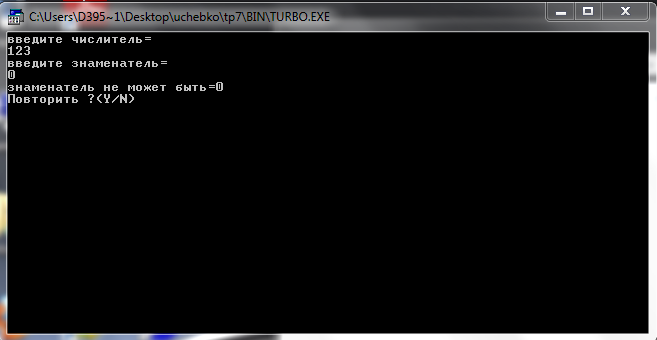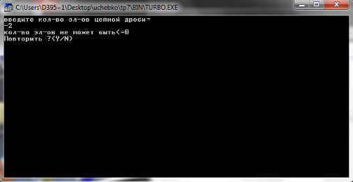 program kurs; uses crt; function pow(a,x:longint):longint; var t,i:longint; begin t:=a; for i:=1 to x-1 do t:=t*a; pow:=t; end; {pow} {----------------------------------------} procedure DelOstatok; var dd:array [1..200] of integer; R:integer; {размерность чисел} i:longint; {делитель} k:longint; {остаток} D,a,b:longint; {элементы заданного множества} SUM:longint; {кол-во эл-ов, удовл условию} S,T:byte; q:char; e,j,l,n:integer; maxa,minj,maxj:longint; begin repeat begin writeln('введите ко-во чисел для нахождения НОК делителей'); readln(n); writeln('введите ',n,' чисел: '); readln(dd[1]); maxa:=dd[1]; for i:=2 to n do begin readln(dd[i]); if dd[i]>maxa then maxa:=dd[i]; end; i:=1;while (dd[i]<>0) and (i<=n) do inc(i); if i<>n+1 then writeln('НОК не сущ-ет') else begin e:=1; for i:=2 to maxa do begin maxj:=0; for l:=1 to n do begin j:=0; while (dd[l] mod i=0) do begin dd[l]:=dd[l] div i; inc(j); end; if (j>maxj) then maxj:=j; end; if (maxj<>0) then for l:=1 to maxj do e:=e*i; end; writeln('НОК делителей=',e); end; end; i:=e; write ('введите остаток='); readln(k); if ((i<=0) or (k<0)) then {проверка {вывод эл-ов на экран} end; writeln; end; writeln('Повторить ?(Y/N)'); q:=ReadKey; until q in ['N','n']; clrscr; end; {DelOstatok} {----------------------------------------} procedure Factor; var numb, powers: array [1..100] of longint; c:longint; n:longint; n1,H:longint; i:longint; k,t: longint; q:char; begin repeat write('Введите число='); readln(c); if c<=0 then {проверка на корр числа} begin writeln('число должно быть>0'); readln; exit; end else {вывод мн-ва делителей} begin write('мн-во делителей: D(num)='); for H:= 1 to c do if c mod H=0 then write(H,' '); end; {конец вывода делителей} n:= 1; n1:= 0; while c <> 1 do begin i:= 2; while c mod i <> 0 do {проверка на делимостьс/без остатка} Inc(i); Inc(n1); if n1 = 1 then begin numb[n]:= i; powers[n]:= 1; end else if numb[n] = i then Inc(powers[n]) else begin Inc(n); {увеличение кол-ва простых множителей} numb[n]:= i; powers[n]:= 1; end; {while} c:= c div i; {деление числа на простой множитель} end; {while} {\\\\\\\\\\\\\\\\\\\\\\\\\\\\\\\\\\\} writeln; writeln('кол-во простых множителей: ',n); write('num = '); k:=1; t:=1; writeln('НОД=',k); if k=1 then writeln('числа взаимно простые'); end; begin i:=1;while (b[i]<>0) and (i<=n) do inc(i); if i<>n+1 then writeln('НОК не сущ-ет') else begin d:=1; for i:=2 to maxa do begin maxj:=0; for l:=1 to n do begin j:=0; while (b[l] mod i=0) do begin b[l]:=b[l] div i; inc(j); end; if (j>maxj) then maxj:=j; end; if (maxj<>0) then for l:=1 to maxj do d:=d*i; end; writeln('НОК=',d); end; end; end; writeln('Повторить ?(Y/N)'); q:=ReadKey; until q in ['N','n']; clrscr; end;{NodNok} {----------------------------------------} procedure SuperGorner; type vector= array[1..11] of integer; rvector=array[1..100] of real; var sum,suma:real; i,k,j,b,c,a,n:integer; vec:vector; vecb:rvector; veca:rvector; q:char; BEGIN Writeln('Введите степень уравнения (max = 10)'); Readln(n); if n<=0 then writeln(‘степень не может быть<=0’) else begin Inc(n); writeln('введите его коэффициенты:'); for i := 1 to n do read(vec[i]); while vec[i]=0 do Begin i:=i-1; writeln('ответ:0'); End; k:=1; b:=vec[i]; for j:=1 to abs(b) do begin if (b mod j)=0 then begin vecb[k]:=j; k:=k+1; procedure AntiExp; var s: array [1..100] of integer; a,b,i,n,t:integer; q:char; begin repeat writeln('введите кол-во эл-ов цепной дроби='); read(n); if n<=0 then writeln(‘кол-во эл-ов не может быть<=0’) else begin writeln('введите значения этих эл-ов='); for i:=1 to n do read(s[i]); a:=1;b:=s[n]; for i:= n downto 2 do begin t:=s[i-1]*b+a; a:=b; b:=t; end; writeln; writeln(b,'/',a); end; writeln('Повторить ?(Y/N)'); q:=ReadKey; until q in ['N','n']; clrscr; end;{AntiExp} {----------------------------------------} var k:integer; q:char; begin writeln('Дискретная математика'); writeln('Курсовая работа, группа 03-119, каф308'); writeln('выполнил: Тузов И.И.'); writeln('руководитель: Гридин А.Н.'); writeln; writeln('Калькулятор с функциями, описанными ниже'); writeln; Writeln('Нажмите Enter'); readln; clrscr; repeat writeln('Какую выполнить операцию?'); writeln; writeln('1-вычисление мн-ва N-значных чисел с заданным делителем и остатком '); writeln('2-факторизация числа'); writeln('3-нахождение НОД и НОК чисел'); writeln('4-нахождение рационльных корней уравнения с целочисл коэфф'); writeln('5-перевод рациональной дроби в цепную'); writeln('6-перевод цепной дроби в рациональную'); read(k); |
