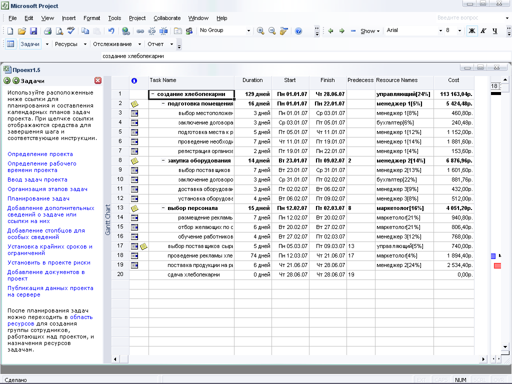 2. Проект создания хлебопекарни состоит из следующих фаз и задач (в скобках указана длительность):