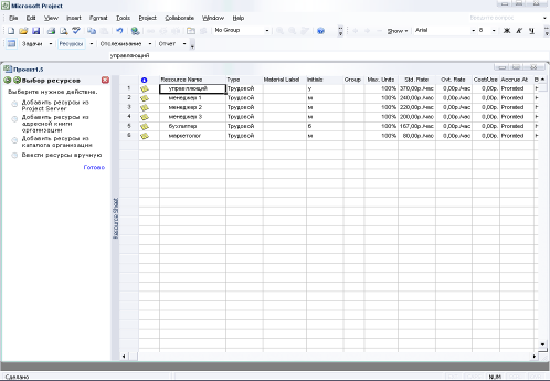 Для определения ресурсов проекта, сделаем активной вкладку Ресурсы. Из появлявшегося справа списка выбираем пункт Укажите типы заказа ресурсов. Двойным щелчком мыши в пустой ячейке поля Имя ресурса вызывается окно Сведения о ресурсе. В этом окне вводим необходимые данные, в том числе указываем тип ресурса. Сделав активной вкладку Расходы, указываем стандартную ставку.