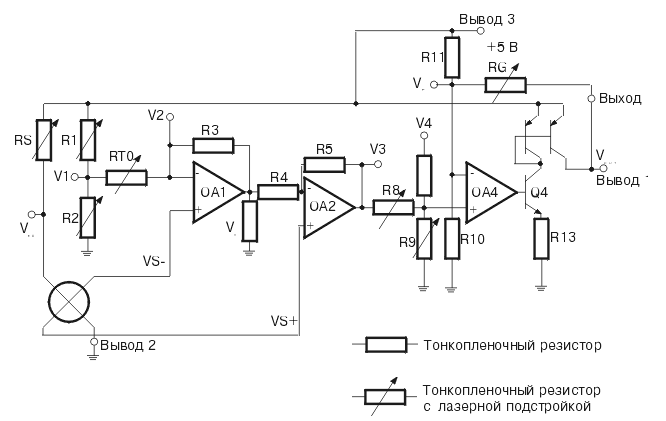 Датчик оснащён схемой нормализации выходного напряжения, которая реализована посредством четырёхкаскадного биполярного линейного усилителя с использованием тонкоплёночной технологии и интерактивной лазерной подгонкой, она имеет следующий вид: