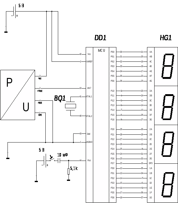 Для электронных весов нужно выбрать семисегментный индикатор, имеющий четыре разряда.