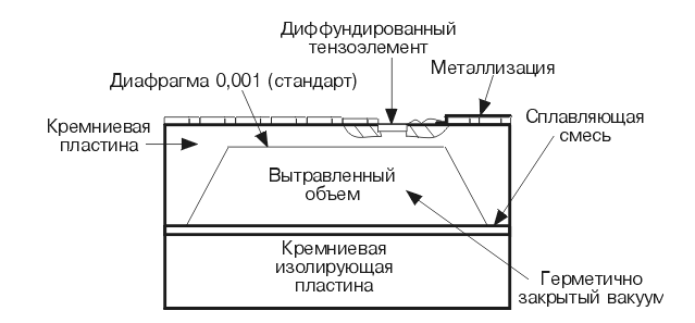 Датчик абсолютного давления. Абсолютное давление, такое как барометрическое давление, измеряется относительно вакуума во встроенной в кристалл датчика полости.