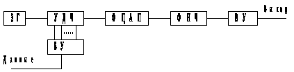 блок демодулятора прямого канала (ДМПрК), состоящий из модулятора М2, полосовых фильтров ПФ1 и ПФ3 – (1030-1970)Гц и задающего генератора Г2 – 1500Гц, усилителя-ограничителя УО1, формирователя коротких импульсов ФК1, одновибратора ОВ1, фильтра низких частот ФНЧ1 и порогового устройства ПУ1. Расчёты параметров структурных блоков демодулятора и принцип их построения были рассмотрены в пункте 3.4;