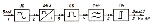 блок демодулятора обратного канала (ДМОбрК), состоящий из полосового фильтра ПФ2, имеющего полосу пропускания (360-420) Гц, усилителя-ограничителя УО1, формирователя коротких импульсов ФК1, одновибратора ОВ1, фильтра низких частот ФНЧ1 и порогового устройства ПУ1. Расчёты параметров структурных блоков демодулятора и принцип их построения были рассмотрены в пункте 3.4