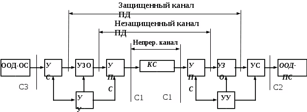 Она состоит из оконечного оборудования, выполняющего функции отправителя (ООД—ОС) и получателя (ООД—ПС) сообщений, устройства защиты от ошибок (УЗО), устройства преобразования сигналов (УПС) и канала связи. В УЗО происходит кодирование-декодирование данных. УПС осуществляет преобразование сигналов данных в форму, удобную для передачи по каналу связи, а устройства сопряжения (УС) обеспечивают обмен информационными и управляющими сигналами между АПД и ООД. Координация взаимодействия составных частей СПД обеспечивается специальными импульсами, вырабатываемыми устройством управления (УУ). Совокупность непрерывного канала с включенными на его входе и выходе УПС называют незащищенным (НК) или каналом передачи данных (ПД), а объединение НК с УЗО – защищенным от ошибок (ЗК) каналом ПД. Для обмена информацией между абонентами используются две однонаправленные СПД, которые конструктивно могут быть выполнены в виде одной дуплексной СПД.