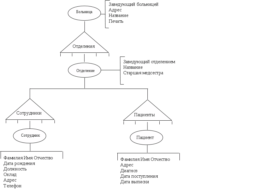 Основным объектом в рассматриваемой модели является больница. У больницы есть свои характеристики: заведующий больницей, адрес, название. Она представлена в виде составляющих ее отделений, которые тоже имеют ряд характеристик: заведующий отделением, название отделение, старшая медсестра.