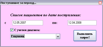 Выбрав запрос "Поступавших за период", появляется окно запроса, представленное на рисунке 6.13, где можно ввести период, в пределах которого вам нужен список больных.