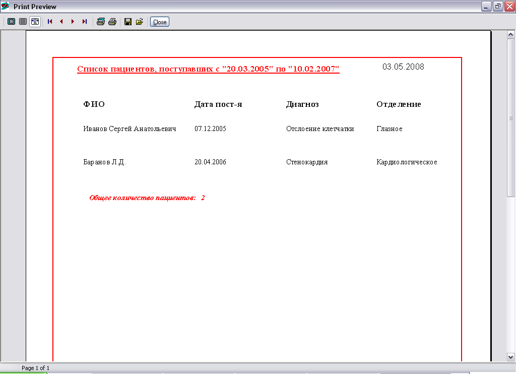 Рисунок 7.6 – Отчет "Список пациентов по дате поступления"