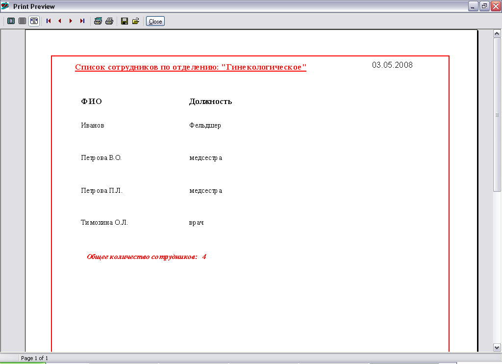 Рисунок 7.2 – Отчет "Список сотрудников по отделению"