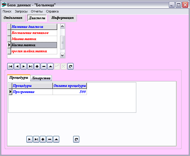 Здесь приведена информация непосредственно для врачей, т.е. какие процедуры и лекарства использовать для определенного диагноза. В свою очередь, врач также может дополнить таблицу новыми данными. Он может добавить новый диагноз, процедуры и лекарства, которые применяются для его лечения. Также есть возможность редактирования уже имеющихся данных.