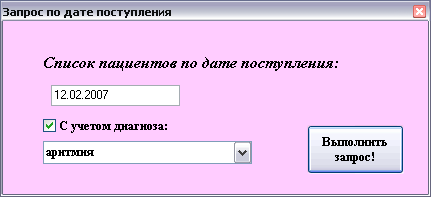 Выбрав запрос по дате поступления, появляется окно запроса, представленное на рисунке 6.12, где можно ввести ту дату поступления, относительно которой формируется список пациентов. Аналогично выполняется запрос по дате выписки.