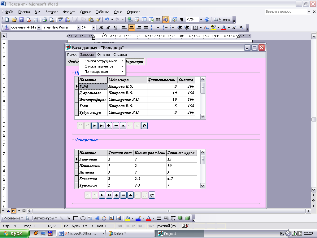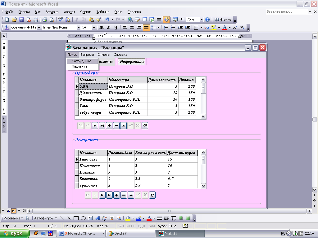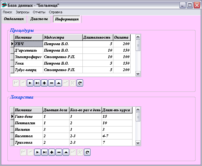 В базе данных должна быть справочная информация для врачей о диагнозах и способах их лечения; о процедурах, которые имеются в больнице и их оплате; о лекарствах, имеющих место в медицине.