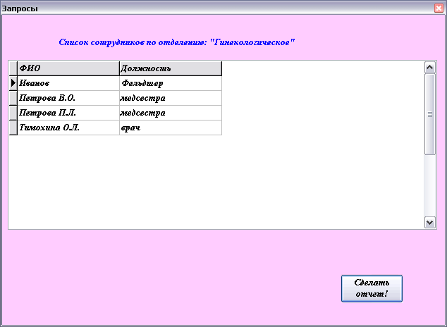 При нажатии кнопки "Выполнить запрос!" появляется окно результатов запроса, изображенное на рисунке 6.9. Здесь также можно сразу сделать отчет по данному запросу, если эти данные необходимо вывести на печать.